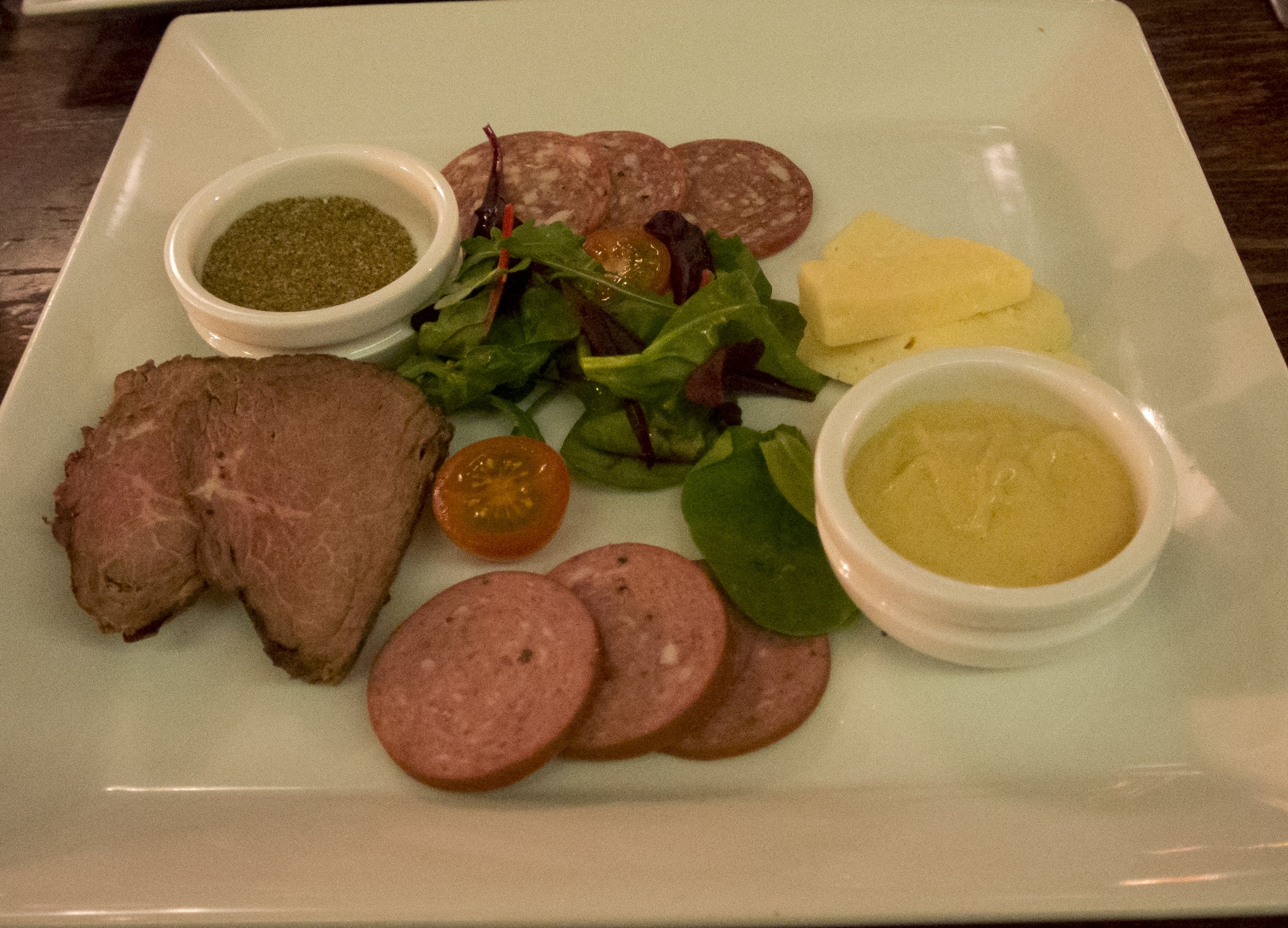 Our little cabin was adorably small but just fine enough for our purposes. The hotel was quite conveniently located, moored across the bridge from Gamla Stan. We attempted to get a bit of work done (I finished up my stats final) before trying to decide where to go to get some dinner. We had been forewarned that food is expensive in Scandinavia, but it was still quite jarring to sift through countless restaurant websites, with mains easily running at $40 a pop. It became a genuine challenge to find any place, even a pub of some kind, that served semi-reasonably-priced food. We finally settled on a pub called Oliver Twist, that wasn’t too far away and seemed to offer burgers and the like. After venturing back onto the snowy streets, meandering our way on a somewhat circuitous route, we found out and grabbed ourselves a pair of stools. We ultimately decided on basically a pair of appetizer platters for about $20 each. Mine included a selection of 3 little appies, including a mini elk burger with sweetened lingonberries, a slice of västerbotten cheese pie with sour cream and chanterelle toast (cream braised mushrooms on toast). David went with the game platter, which included a selection of reindeer sausage, elk sausage, elk roast beef and mature cheese. They weren’t massive portions, but they were super delicious. I’d never had elk before (which D suspects is actually moose, as they call them elk in Europe), but it made for a tasty burger. D was amazed to find beers from Left Hand Brewing out of Colorado and had himself a bottle ($12!) and I ventured a piccolo size of brut. We were soon comfortably full and made our way back to the hotel for the night.