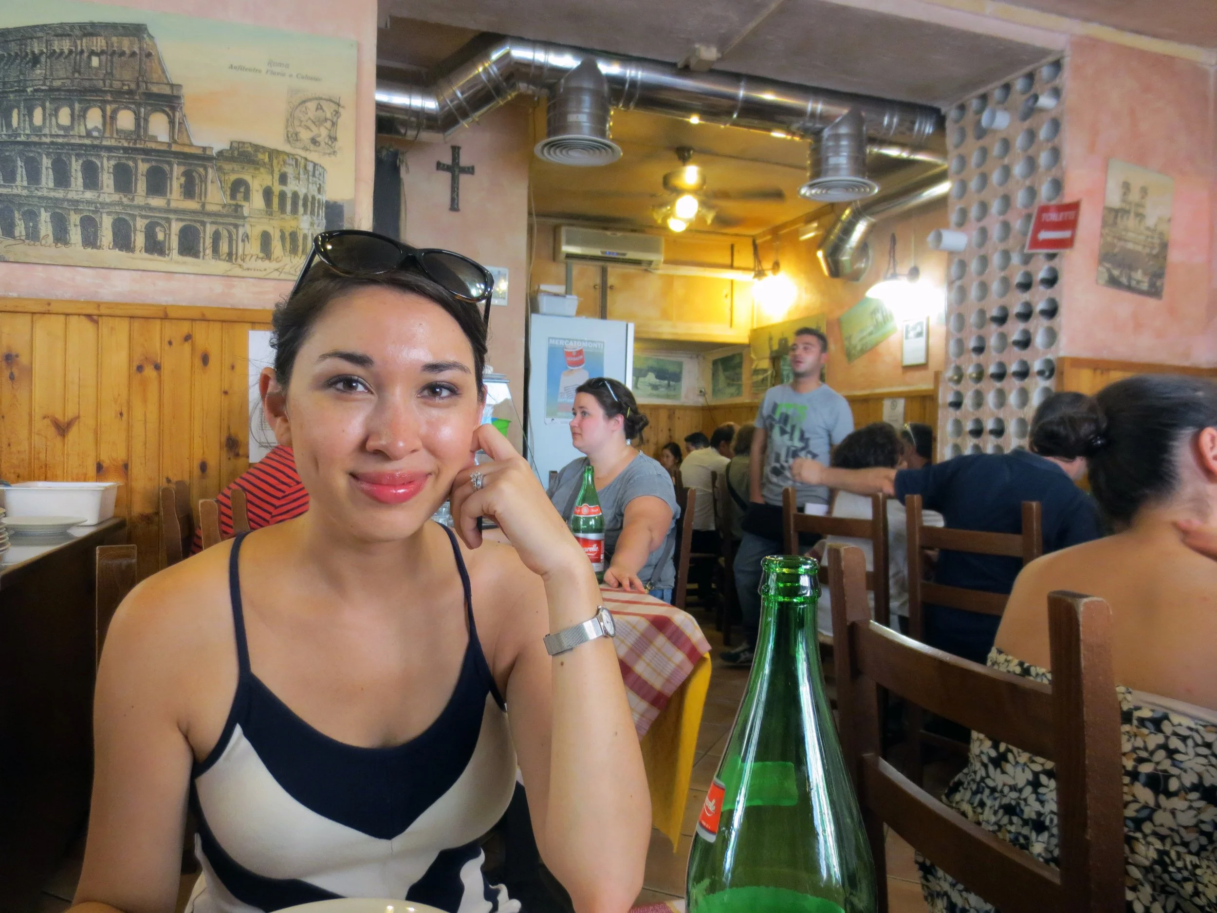 We had pre-determined that we could take a nearby bus home, so we paid up and made our way to the bus stop to catch it. However, a bit of internet searching had informed us that you couldn’t actually purchase bus tickets on the bus–you had to buy it at a metro station or bar/tabacchi. We weren’t near a metro station (otherwise we would have taken it) and being Sunday, we couldn’t find a tabacchi open. We wandered around trying to find something, cursing a somewhat silly transit system that required you to not only pre-plan your bus trip such that you’d buy your tickets in advance. After much wandering and much wavering over whether to just take a cab (which would’ve been quite expensive), we ultimately decided to heed the advice of some locals that had said that at night, tickets aren’t really checked. There was a tram going along the street we were on that would take us into the center of town (Piazza Venezia) and from there, we could walk to the Metro. We somewhat nervously rode the tram (criminals!), though we reasoned that we would have happily paid if actually given the opportunity to purchase a ticket. We were relieved to arrive at Piazza Venezia, as it was at least an area of town we were familiar with. We made the trek over to the Metro station, a good 15-20 minute walk. We tried to see the silver lining of our transportation gaff by reasoning that we got to see sights like the Trevi Fountain all lit up. We rejoiced in finally reaching the Metro and went to buy tickets, only to discover that Angela was short 20 cents in change (and the machines don’t provide more than 6 euros change). Amazed at our luck, we went back out of the metro station and went in search of a shop to buy something in order to get change. The first little drink shop we stopped at to buy a bottle of water didn’t have enough change for a 20. Mercifully, the second shop did, and we gratefully snagged our bottle of fizzy water and change. After the Herculean task that was our trying to get home, we were extremely relieved to get back to the apartment and call it a night.