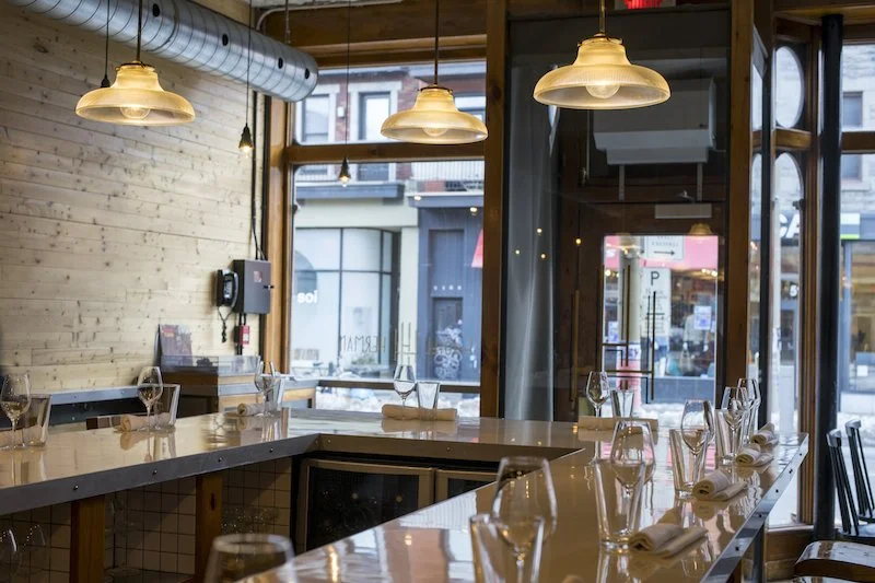 Bellies full of chocolate, we decided to make our way back over to Boulevard Saint-Laurent for a bit of browsing. We amused ourselves along the way with photos of the fun murals and street art (many of which involved bagels). We eventually made our way over to Hotel Herman, a interesting spot that we’d passed the day before and, upon further poking around on the Interweb, looked to be a good place to have some dinner. The interior was beautifully designed, with a gorgeous U-shaped bar that dominated the space. We started off with a pair of cocktails. I had “La Farigoule”, a pear-based drink with thyme and lemon juice (absolutely delightful!), and David had a “Bitter Smoke”, Scotch, Montenegro and Vermouth, (also delightful).