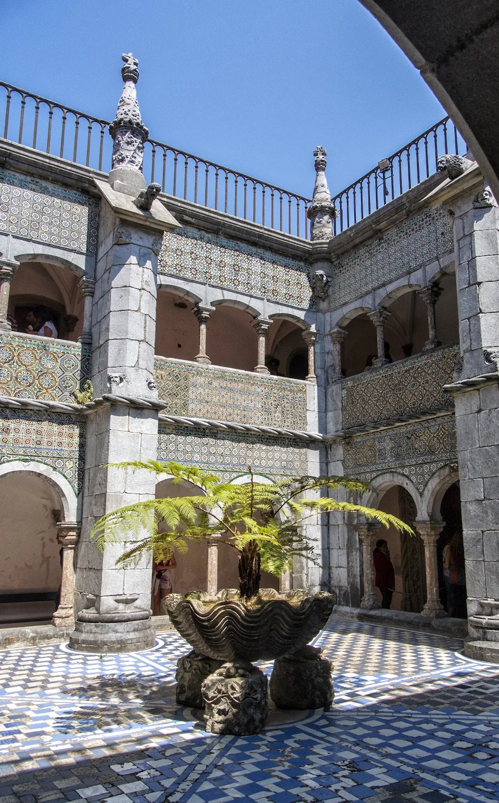 Panting and sweaty, I eventually made it to the palace. Being a Romanticist palace, it drew upon an eclectic mixture of exotic architectural styles (Islamic, Manueline, Gothic, etc.). It looked almost like a Disney palace, a riot of bright colours and over-the-top style. Being atop what felt like a small mountain when I was trekking up it, it afforded fantastic views of the town and surrounding area from its parapets. The palace walls were adorned with beautiful tile work and intricate carvings, so much time was spent staring up at its grandeur. I eventually decided to check out the interiors of the palace and discovered, to my dismay, that the line to get in extended from the entrance, through a large courtyard, and out around the other side. I resigned myself to my fate, threw in my headphones and waited (I ultimately spent a lot of time, even inside the palace, with my headphones in, as it was an effective way of tuning out the din of all the people). The line moved at a glacial pace, and it was probably a good 30-40 minutes before I actually got inside.