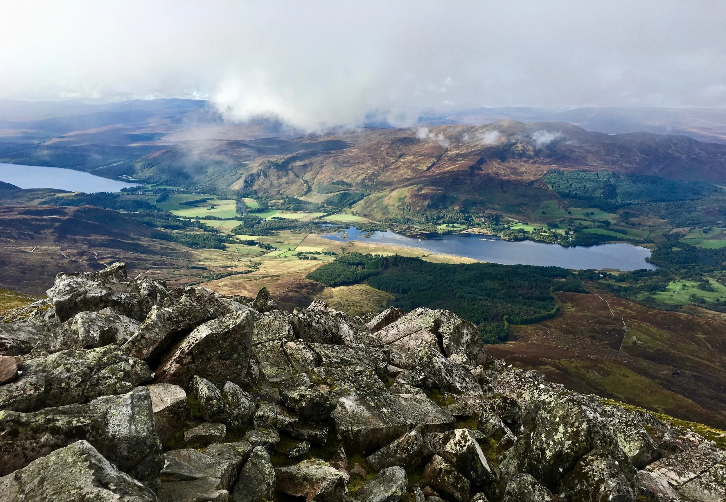 After about 45 minutes of scrambling through the rocky scree, I finally reached what I assumed was the top. I thought this was a fair assumption, as there was literally no more mountain to climb. There was also a tiny little pile of rocks marking my success. Upon seeing that I’d made it, I actually fist pumped and burst out laughing–whooping with happiness. To reward my travels, the sun shone out gloriously, and I was treated to truly breathtaking views of Loch Rannoch and Loch Tummel. It was also incredibly windy, which only served to invigorate me further. As a kid, I remember that I loved standing outside at recess on super windy days, just to feel the force of it blowing around me. In many ways, it was the same feeling here–the sheer joy of being swept up in swirling winds. I was cognizant of the fact that I was rather precariously perched on top of a mountain, so I was careful not to get too swept up in it all. Amazingly, within minutes, clouds rolled in, and I was enveloped in a sea of grey. Considering I’d need to now pick my way back down through the rocks, I figured I’d wait a few minutes to see if they’d clear a bit, so I’d have better visibility. Mercifully, the clouds obliged, and the wind blew them through, leaving me with clear blue skies again.