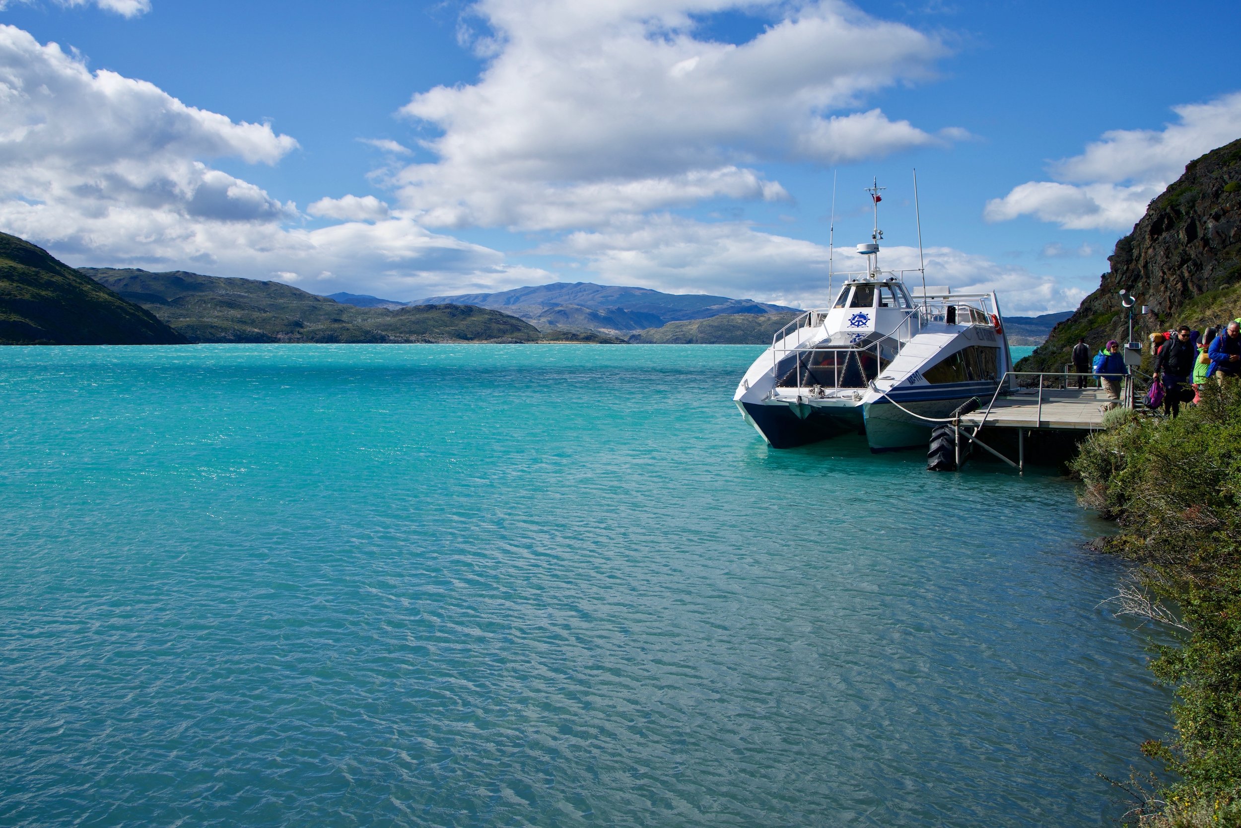 Crowds grew as we waited for the catamaran, and clouds started to darken, threatening rain. We eventually filed on and stowed all of her backpacks and gear up at the front of the boat in a massive, Jenga-like pile. The crossing was about 30 minutes, during which time the rain finally opened up. I was beginning to dread that I'd be battling a cold and rain on the first day of my hike. However, miraculously, it was gloriously sunny when we reached our destination, Refugio Paine Grande. And boy were we treated to an epic welcoming view, with rugged, snow-touched mountains rising behind the lodge. Thrilled at the weather, I hurriedly checked-in and stowed my main pack in my bunk, throwing on my day pack and heading off for the trail along Lago Grey.