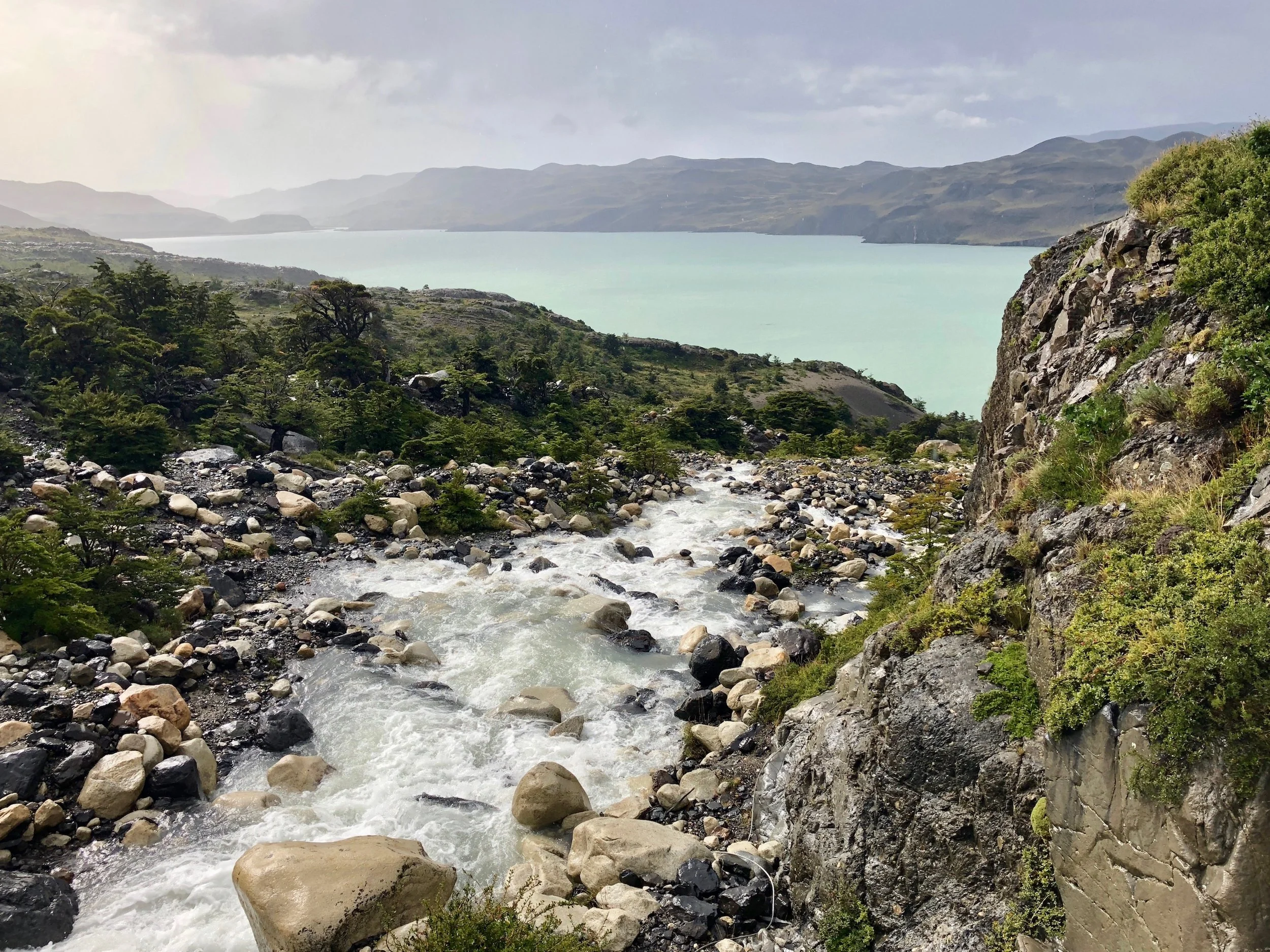 I was ultimately given a reprieve from the steady rain, and I gratefully took a pause to rest and rehydrate. The problem with rain gear, however, is that it’s not terribly breathable, so I was definitely feeling fairly toasty at this point. I took a chance and stripped off my rain pants and jacket and continued along the lake side trail. The rainfall had flooded the rivers and streams, leading to powerful waterfalls and rushing water. I followed the trail down to the bank of a large stream/small river with fast-flowing water that had a small island of rocks in the middle. The other side of it had no bank whatsoever and was really just a steep hill of dirt and loose pebbles. I’d been warned by hikers coming back up the trail that there wasn’t really any good way across at that point (they were off in search of a better crossing). I was surprised that the trail had led here and assumed that this would normally be a trivial crossing, but that the heavy rainfall had given rise to more challenging waters. I looked downstream and saw other hikers attempting to cross, typically knee-deep in water. By chance, two hikers came from the other direction, throwing each other and their packs to one another rather precariously. I leapt my way across to the rocky island but was a bit leery of jumping onto a steep hillside with my pack on (I worried I’d teeter backwards into the water). One of the hikers graciously offered to throw my pack to me. So I mustered up my best grand jeté ballet jump and made the leap from the island to the other side, miraculously keeping my footing. He threw me my backpack, and I carried onwards, grateful that I hadn’t tried the other crossings only to be rewarded with soggy boots for my effort.