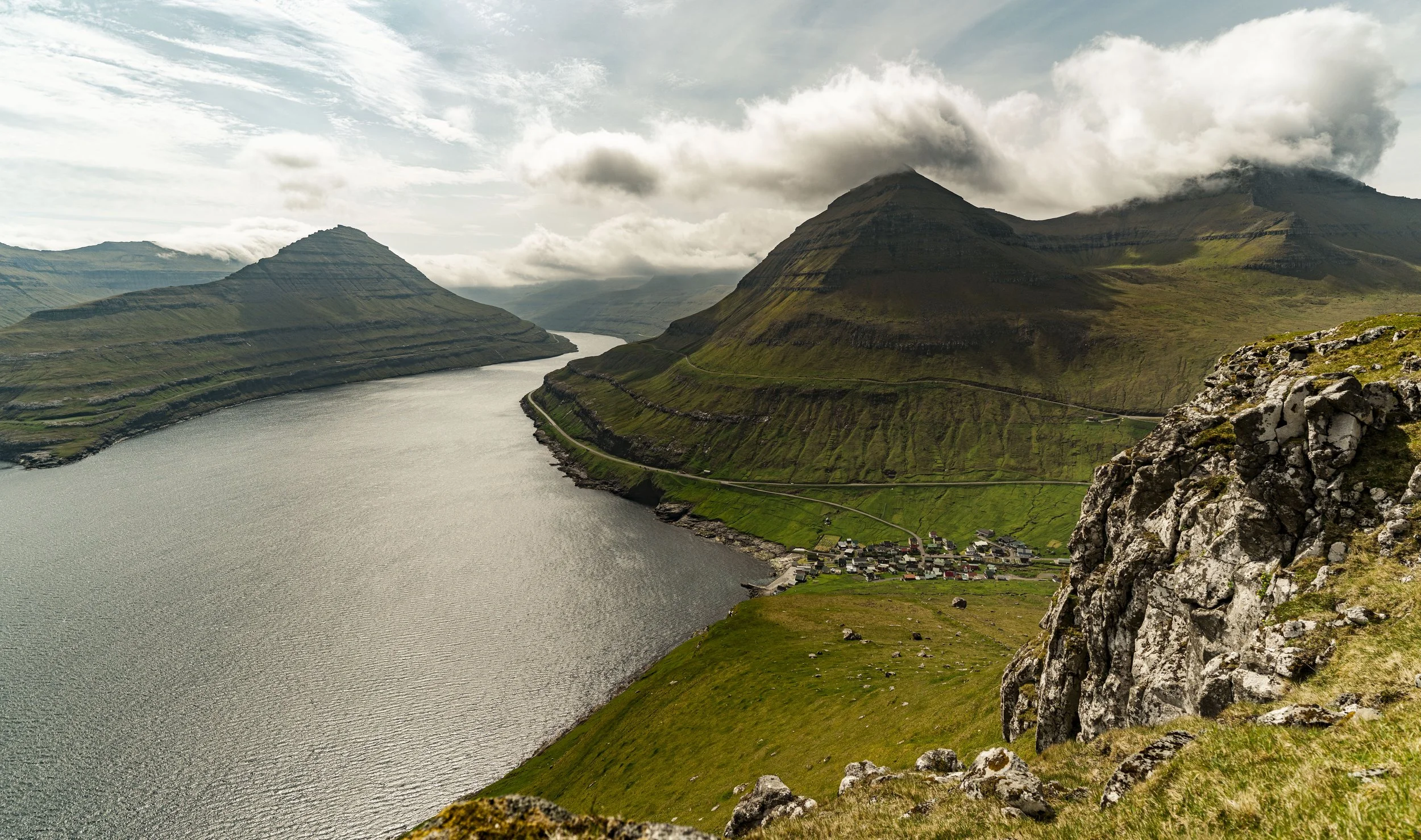 For our relatively minimal effort, we were afforded a stunning, panoramic viewpoint—complete with a small railing to prevent people from falling off the cliff (only at that specific spot)—of Funningsfjørður fjord and the surrounding mountains.